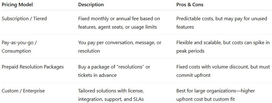 Some vendors sell “resolution bundles” or prepaid ticket packages. You pay upfront for a set number of customer issues the AI will handle. This approach provides cost control and sometimes discounts for bulk purchases, but it requires commitment ahead of time.